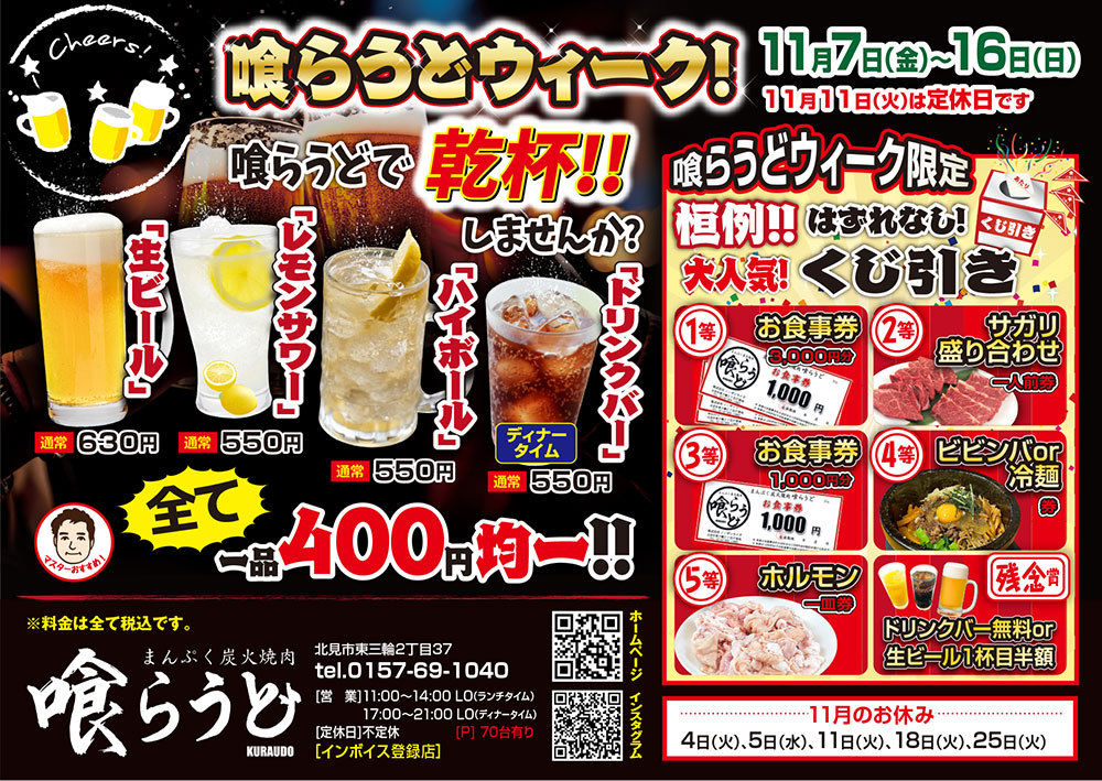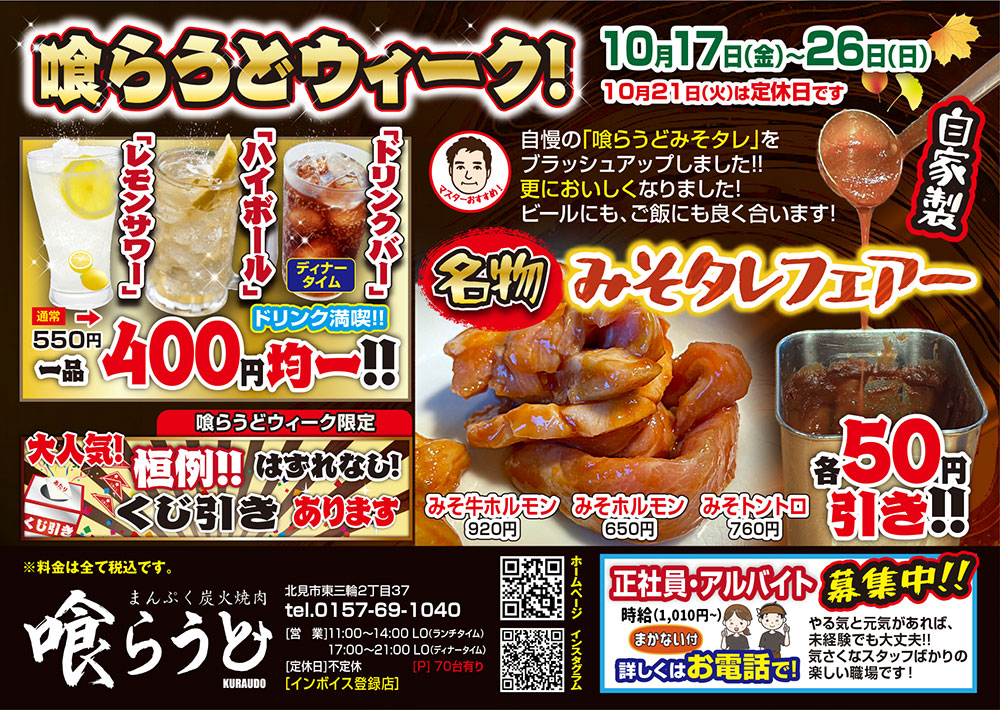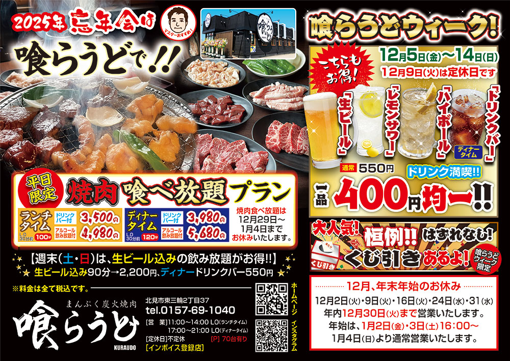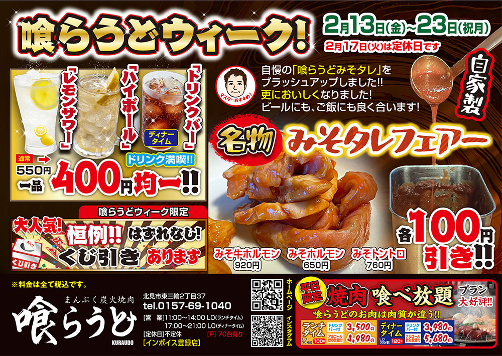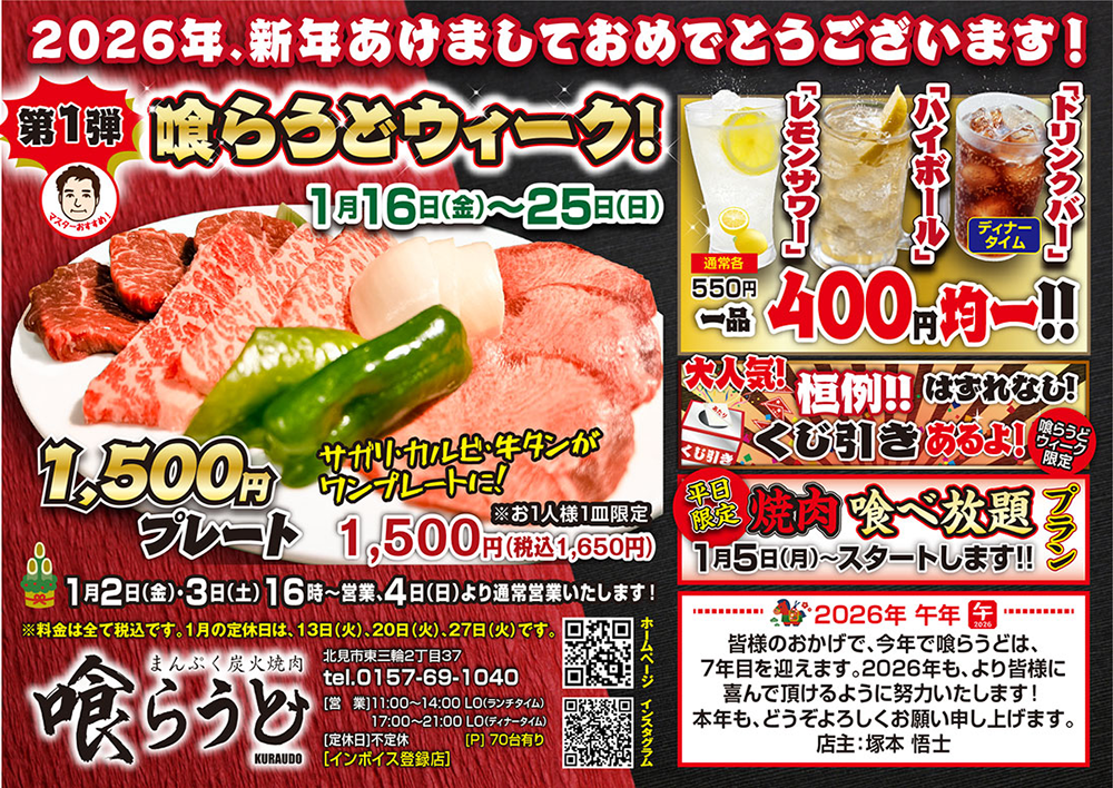 いつも「喰らうど」をご愛顧いただき、誠に有難うございます。「焼き肉の街 北見」に開業して早3年が経ちました。